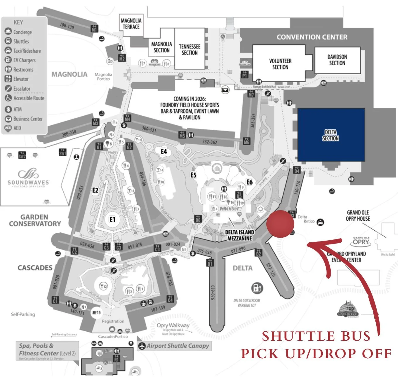 Pick-up/drop-off will be at the Gaylord Opryland Delta Portico. Follow the signs to board the buses.